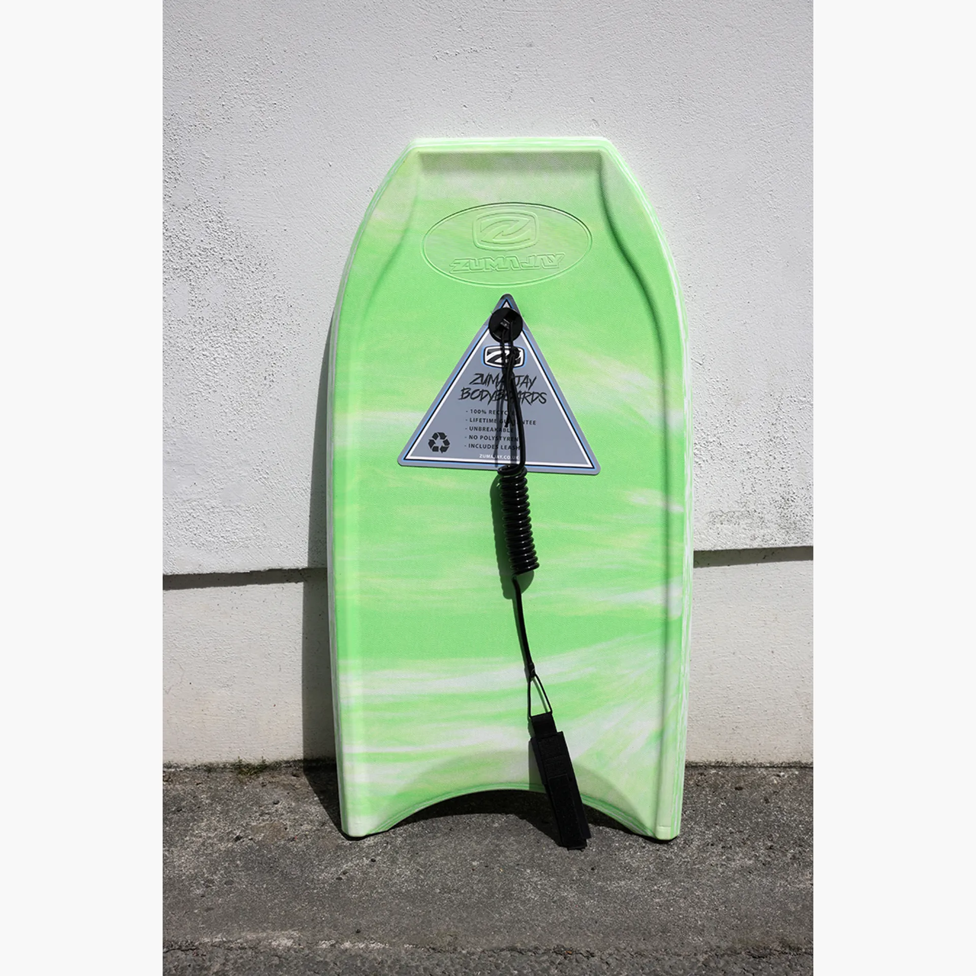 Our all new Zuma Jay boards are now made from recyled polyethelene, offering an even more positive environmental impact!The Zuma Jay 34 Bodyboard is for the little nippers. They all have high density EVA moulded construction making them unbreakable.The cheaper boards that some shops sell have a polystyrene core and as soon as they are bent slightly they snap in half. A cubic metre of water weighs a tounne and its inevitable for the cheaper boards to snap. Our boards can be bent right in half and we guarentee it will never snap!The multicoloured pattern on the board is unique, no two boards will be identical.